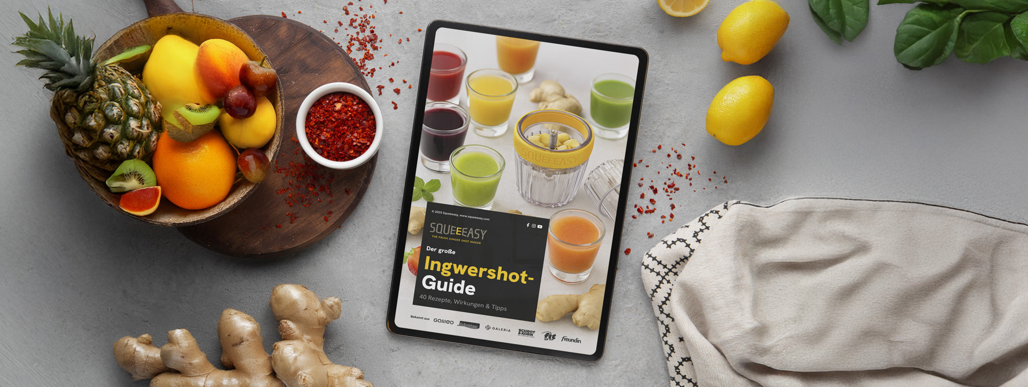 Du liebst Ingwer? Mit dem Squeeeasy® und dem exklusiven Rezept-E-Book zauberst du im Handumdrehen frische, leckere und gesunde Ingwershots. Alles, was du brauchst, in einem Bundle!